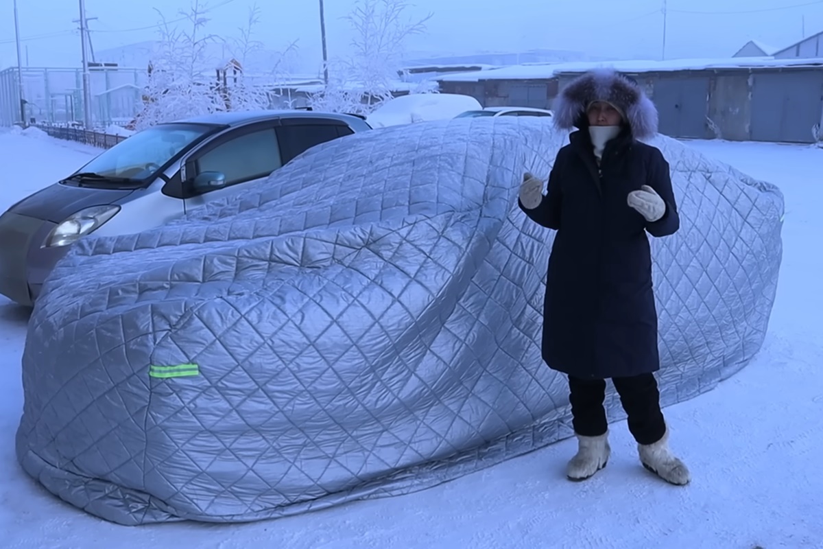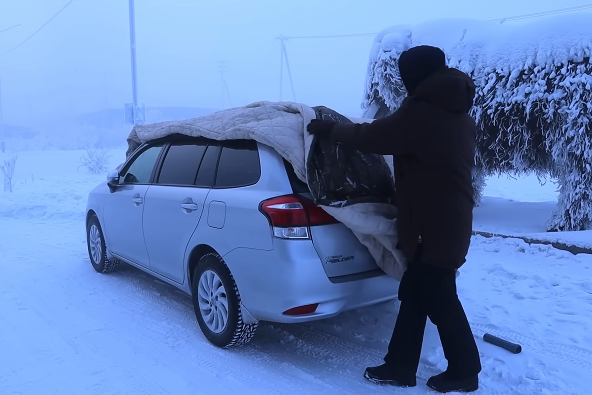 【引用:Youtubeチャンネル「Maria Solko」】そのためヤクーチアではエンジン保温が必須となる。エンジンの上に専用ブランケットをかけ、車両前面には風よけカバーを装着し、走行中も冷気で温度が下がらないようにする。これは快適性のためではなく、車が動くための最低条件だ。さらに室内凍結を防ぐため、補助の室内窓を設置し外気との間に空気層を作る工夫も一般的だ。路面は常に凍結しているため、スタッドレスタイヤは選択肢ではなく必須装備とされている。