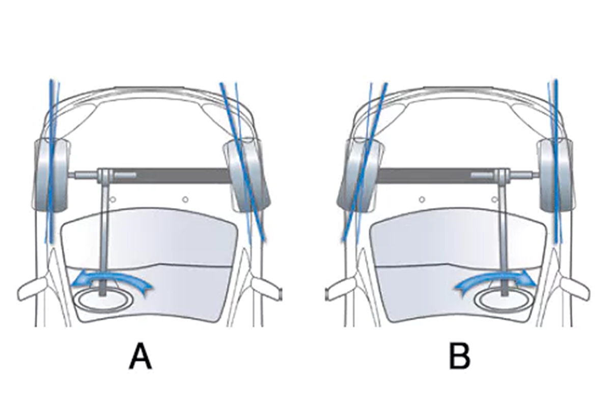 【引用:ミシュラン】点検で最も頻繁に確認されるのがトー角だ。車を上から見た際、前側が内向きならトーイン、外向きならトーアウトと呼ばれ、このわずかな角度が直進性と摩耗を大きく左右する。トーがずれるとタイヤは常に横方向へ引きずられる状態になり、偏摩耗が進行し、ハンドルの微振動やふらつきとして現れる。結果としてタイヤ寿命と燃費の両方を縮める。