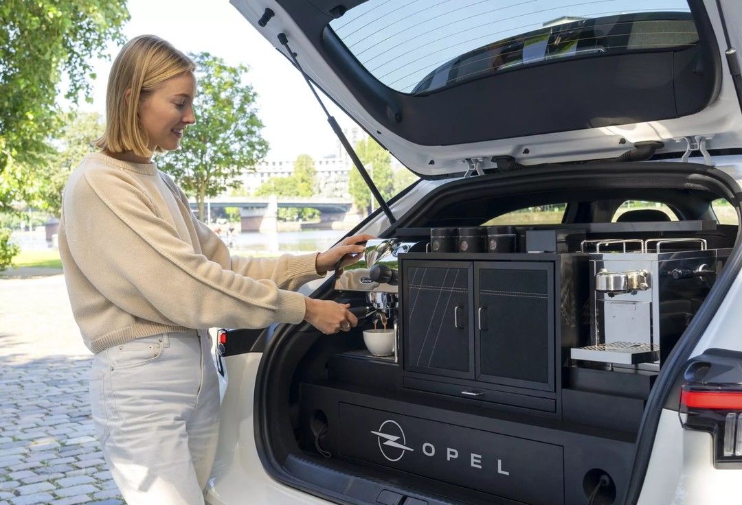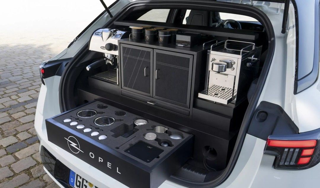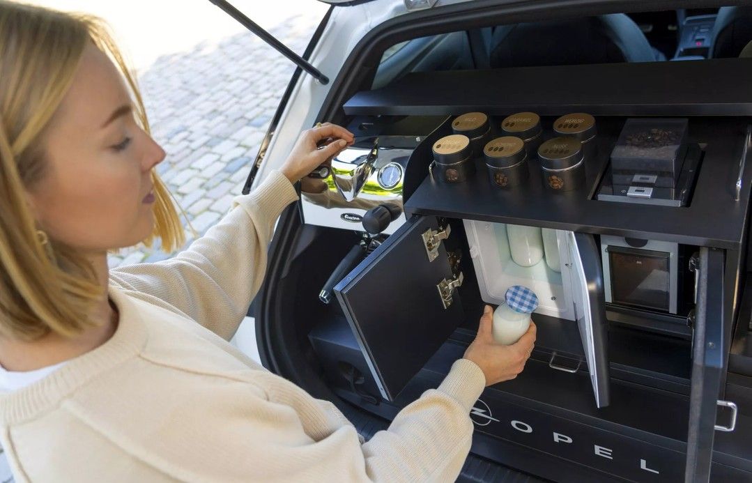 【引用:ステランティス】外観は通常モデルと変わらないが、トランクを開けると驚きの装備が現れる。コーヒー豆用とカプセル用のマシンをはじめ、電動グラインダーやミルクスチーマー、小型冷蔵庫まで備えられ、すべてオペルのロゴ入り専用収納に収められている。その代わり荷室はほぼ失われた。インフォテインメント画面には専用のコーヒーアイコンも追加された。
