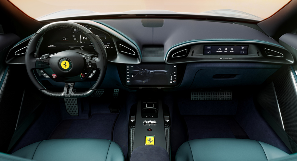 【引用:フェラーリ】インテリアはデュアルコックピット思想を採用し、15.6インチのデジタルメーターパネルと10.25インチのセンターディスプレイ、さらに助手席用8.8インチディスプレイを配置。視認性と直感性を重視した構成で、タッチ式中心だった操作系を物理ボタンへ戻すことで操作性も大きく改善された。