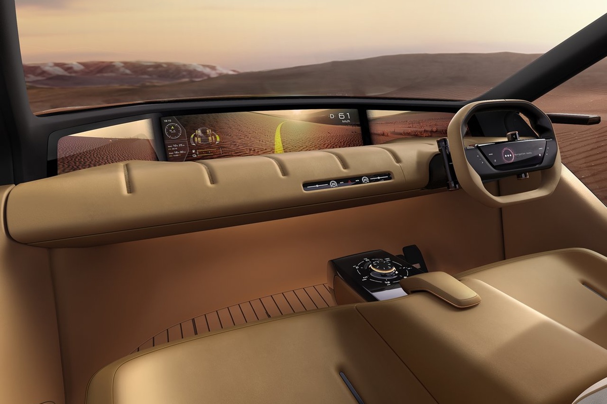 【引用:三菱自動車】室内は3列6人乗り構造で完全フラットフロアを採用。前席が180度回転して後席と向かい合うことができ、ラウンジのような空間を作り出す。ダッシュボードとシートは同素材で統一され温かみを演出。メーターパネルはピラーからピラーまで広がる大型スクリーンで構成され、ステアリングにも補助ディスプレイが内蔵されている。中央ダイヤルでECO、GRAVEL、MUD、SNOWなどを切り替えられ、AI Co-Driverが最適なモードを提案する。