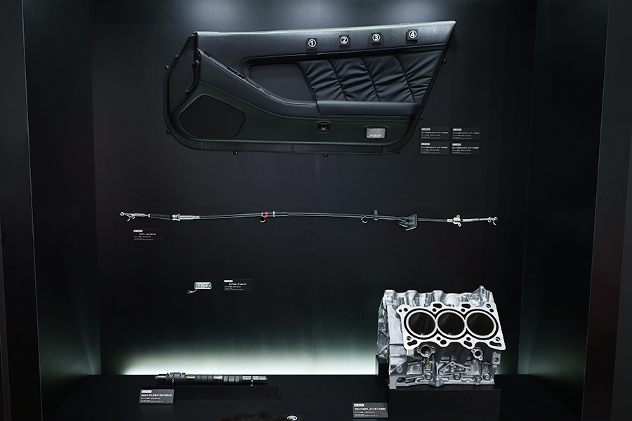 【引用:ソウル経済】別区画の部品展示ゾーンでは、シリンダーブロックやカムシャフトといったエンジン中枢部品に加え、内装トリムやギアセレクターケーブルなども実物展示された。図面が残っていない部品については、現存部品の3Dスキャンと逆設計を用い、当時の純正規格と同等の精度で再現したと説明されている。
